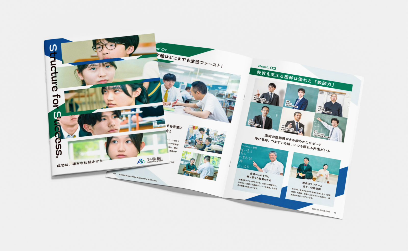 学校のロゴマークに使用されている青と緑を活かした配色で、知性と成長を表現し、パンフレット、ホームページ・ポスターに展開しました。